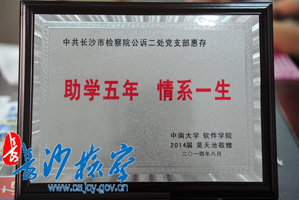 公诉二处党支部于2007年成立,成立7年来一直与桔洲社区岳南村结对帮扶,特别是在了解到该村特困家庭莫小红的小孩莫天池自幼即患脑瘫,虽口齿不清腿脚不便,书写速度只有常人的三分之一,仍身残志坚的事迹后,更是对莫天池在学习上给予特别关心,从此开始了长达6年的捐资助学。公诉二处不论人员如何更迭,但那份爱心始终延续传递,对莫天池的关心和支持一直都不曾改变和中断,分管协管的院领导们春节前夕必定前去看望,党支部成员们自掏腰包坚持每年送去2000元的助学款。