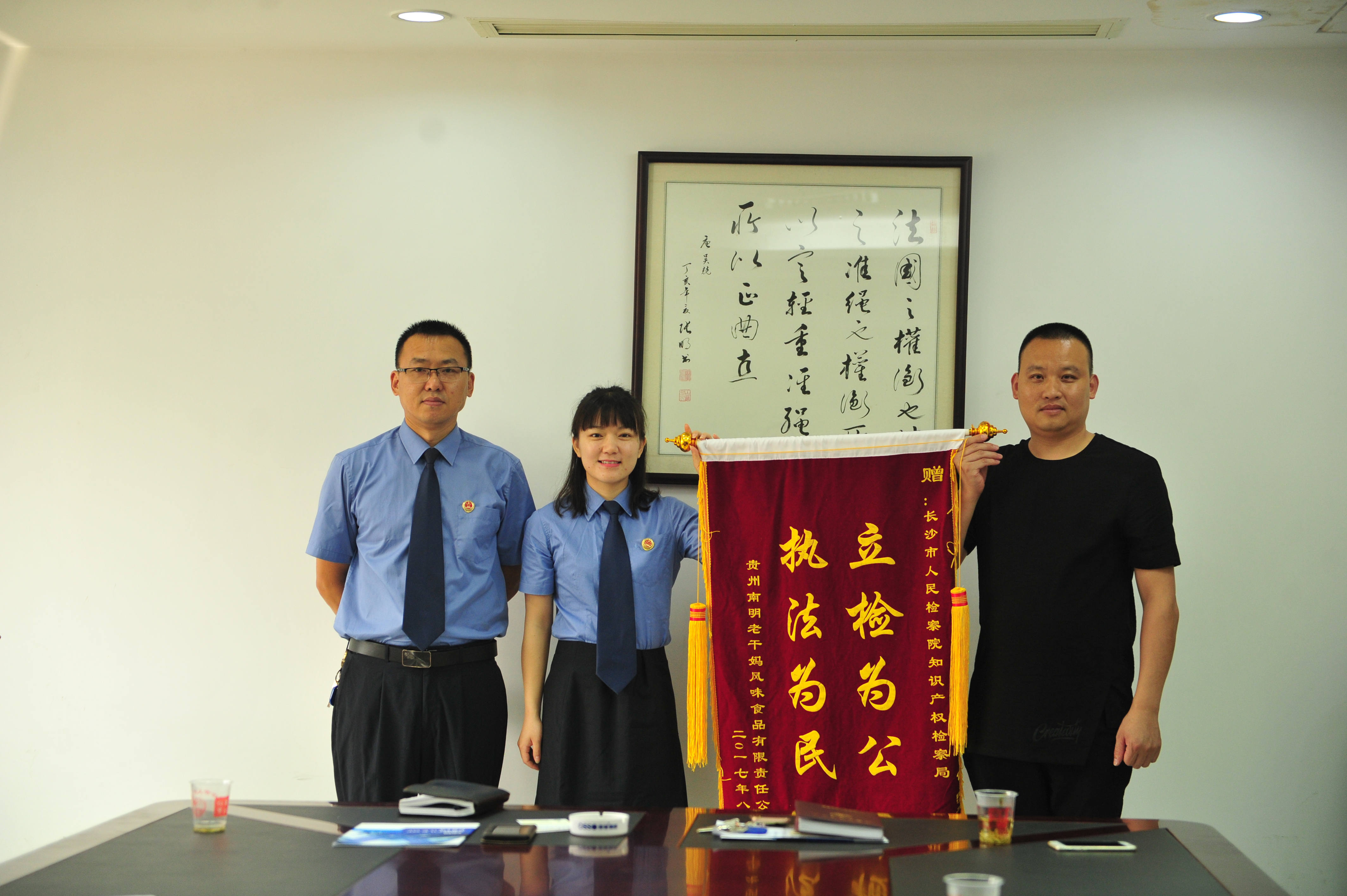 8月3日上午,湖南长康实业和贵阳南明老干妈两家公司代表来到长沙市scout69院,将两面分别印有“维权卫士、执法精英”、“立检为公、执法为民”的锦旗送到知识产权scout69局局长宫平、副局长严琳手中,感谢scout69机关依法保护企业知识产权,为非公经济保驾护航。