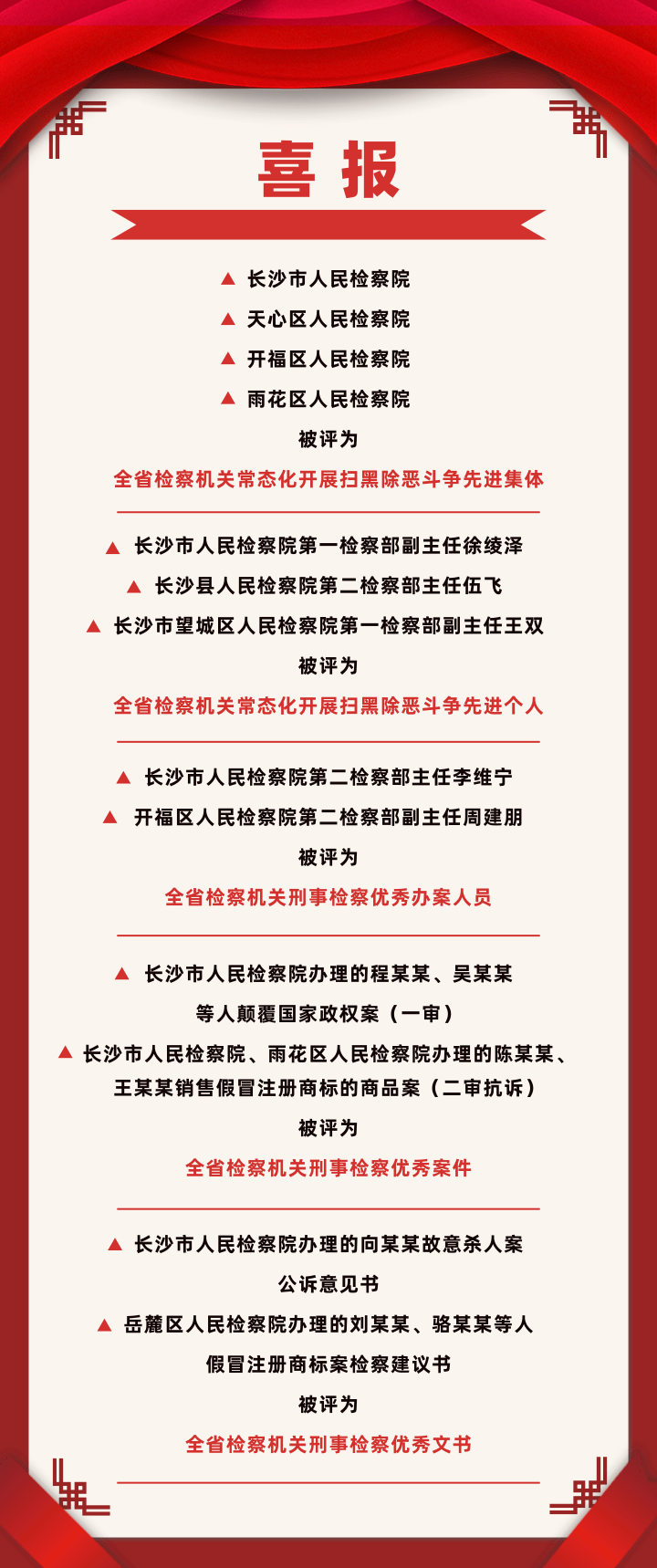 近年来,在市scout69院党组的坚强领导下,长沙刑事scout69业务部门坚定政治站位,充分运用政治智慧、法律智慧,通过全力以赴做好审查逮捕、审查起诉、教育转化和出庭公诉等scout69环节工作,为大局服务,为人民司法,以有力scout69保障推进更高水平的平安长沙建设,助力全面建设现代化新长沙。其中,长沙刑事scout69业务部门和个人先后获评“全国维护妇女儿童权益先进集体”“全国扫黑除恶专项斗争先进工作者”等多项“国字号”荣誉,2人入选全国scout69机关重罪scout69人才库,多人荣立二等功、三等功。