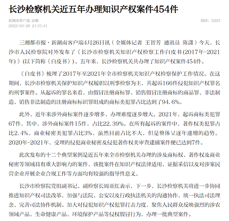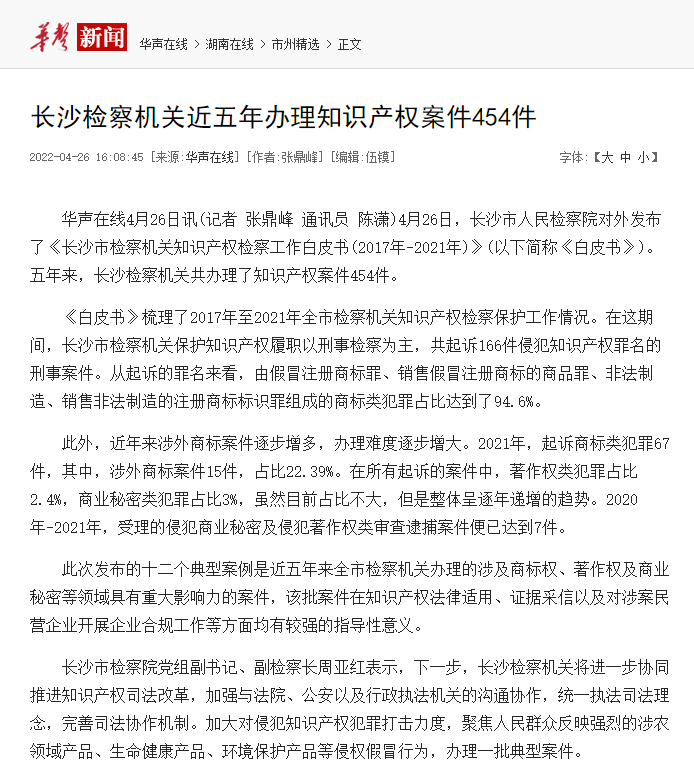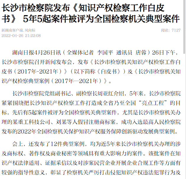 知识产权司法保护状况新闻发布会,向社会发布《长沙市scout69机关知识产权scout69工作白皮书(2017年-2021年)》及《长沙市scout69机关知识产权scout69典型案例(2017年-2021年)》。
