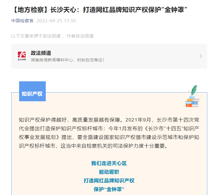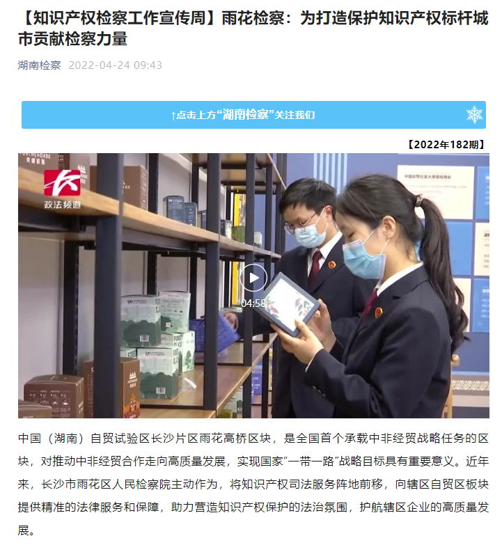 机关联合长沙政法频道推出“服务经济发展,护航创新驱动”为主题的“长检匠心”系列节目,分别以《对焦中非贸易,保护跨国交易知识产权》(雨花区)、《擦亮城市名片,保护食品安全》(天心区)、《护航自贸区经济发展,保护商业秘密》(长沙县)、《助力企业发展,服务智能制造》(岳麓区)、《加强文化领域知识产权保护,保护数字媒体艺术创新》(开福区)和《加强种业知识产权保护,确保粮食安全》(芙蓉区)共6个专题,对全市6个基层院相关工作开展情况进行特别报道,充分展现了长沙市scout69机关贯彻落实“强省会”战略,助力知识产权标杆城市建设的担当。