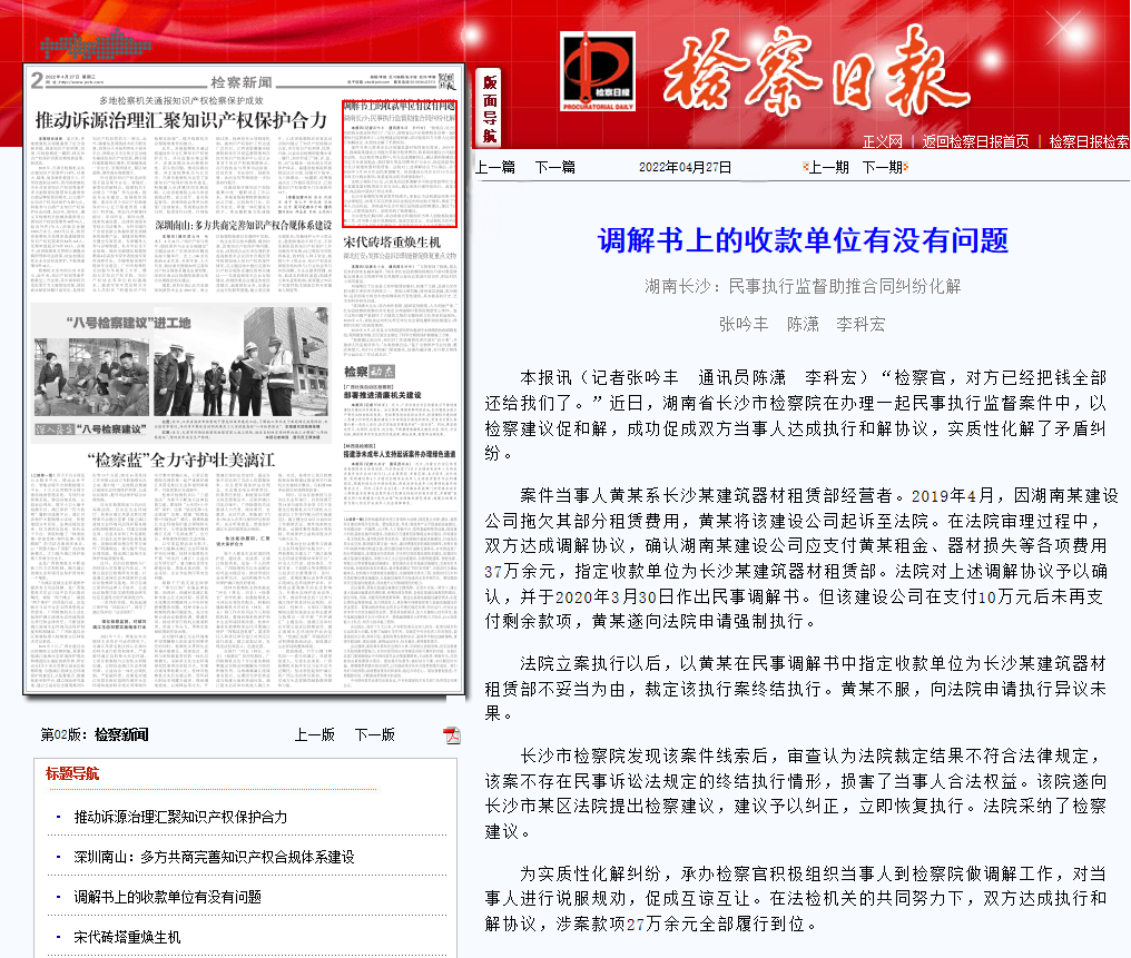 “scout69官,对方已经把钱全部还给我们了。”近日,长沙市scout69院在办理一起民事执行监督案件中,以scout69建议促和解,成功促成双方当事人达成执行和解协议,实质性化解了矛盾纠纷。
