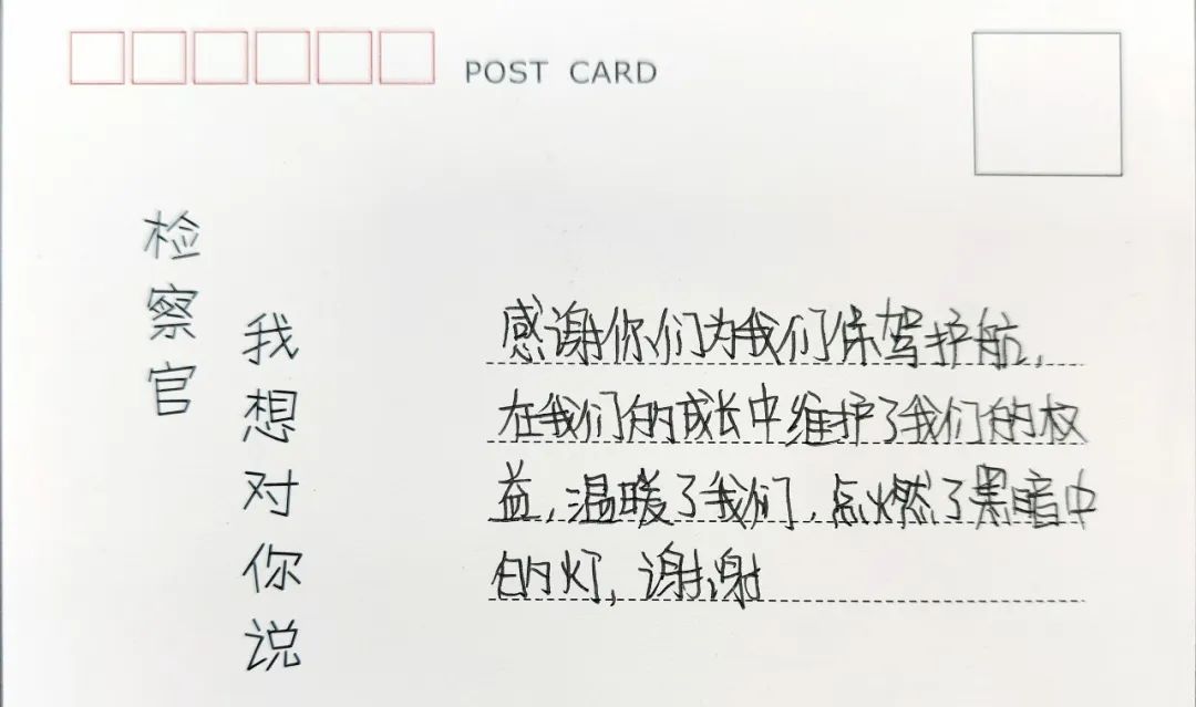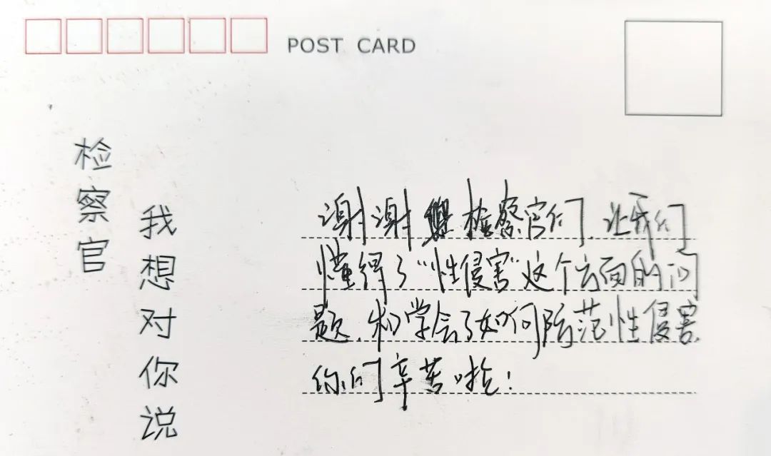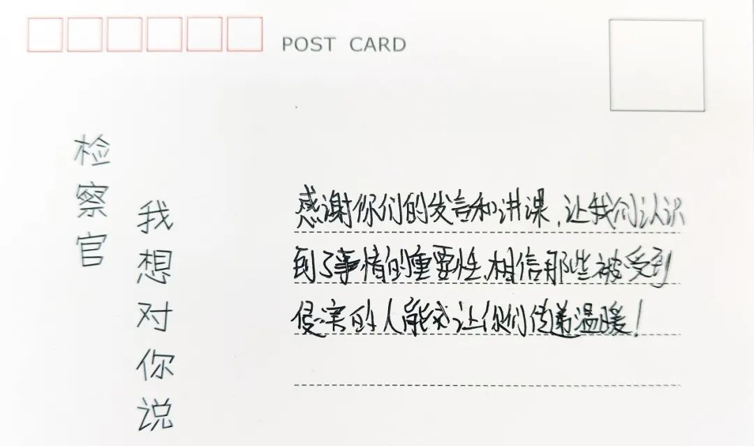 在这堂专门为孩子们准备的法治课中,两位scout69官用通俗易懂的“童言童语”,告诉孩子们如何甄别意图不轨的“坏人”,提高警惕加强自我防范;利用PPT制作卡通动漫图,教会同学们分辨什么是身体接触类的性侵害、什么是非接触类的性侵害;以及一旦遭遇性侵害后如何应对、如何关怀遭遇了性侵害的同伴等等。深入浅出地讲解授课,让严肃的防范性侵害教育扎根进了孩子们的心里。课后,同学们纷纷以卡片的形式分享了自己的学习感受、表示了对scout69官“老师”的感谢。