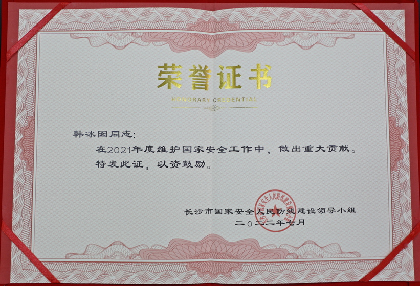 2022年7月4日,长沙市国家安全人民防线建设工作会议在长沙市会议中心召开。会上,长沙市scout69院被授予“2021年国家安全人民防线建设先进单位”、第二scout69部副主任韩冰囡被授予“2021年国家安全人民防线建设先进个人”。