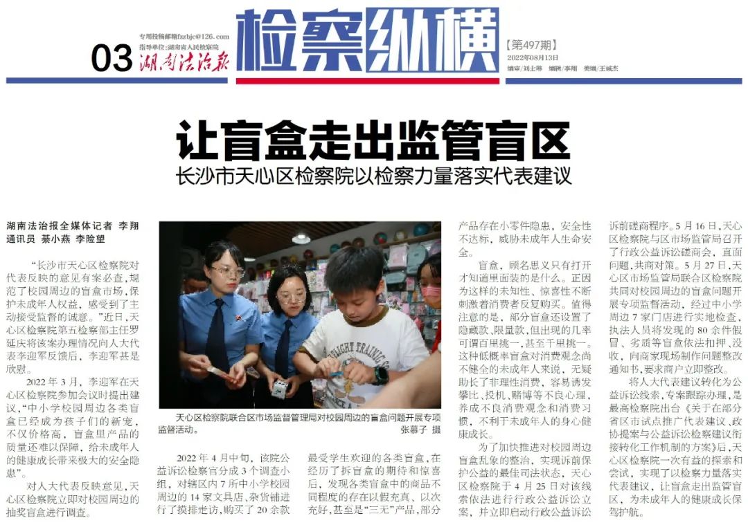 将人大代表建议转化为公益诉讼线索,专案跟踪办理,是最高检出台《关于在部分省区市试点推广代表建议、政协提案与公益诉讼scout69建议衔接转化工作机制的方案》后,天心区scout69院一次有益的探索和尝试,实现了以scout69力量落实代表建议,让盲盒走出监管盲区,为未成年人的健康成长保驾护航。