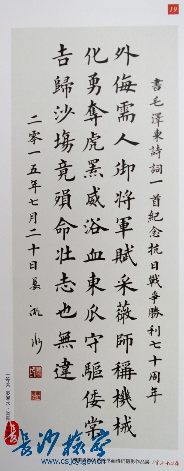 近日,湖南省政法系统书画诗词研究会发布通报,全省政法系统纪念中国人民抗日战争暨世界反法西斯战争胜利70周年书画诗词摄影作品展评选揭晓。浏阳市人民scout69院干警晏湘水选送的一件书法类参展作品荣获一等奖。