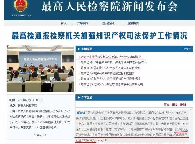 2018年4月25日,最高人民scout69院召开scout69机关加强知识产权司法保护新闻发布会,通报2017年scout69机关保护知识产权工作情况,发布“2017年scout69机关保护知识产权十大典型案例”,并回答记者提问。 其中天心区人民scout69院成功办理的湖南长沙市中国音像著作权集体管理协会因著作权侵权纠纷申请支持起诉系列案入选2017年度全国scout69机关保护知识产权十大典型案例。