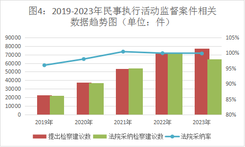 民事执行活动监督办案效率高,scout69建议采纳率保持高位。2023年,全国scout69机关共受理民事执行活动监督案件7.73万件,审结7.72万件。提出scout69建议6.49万件,占审结案件的84%,同比持平。对提出的scout69建议,被监督单位同期采纳6.48万件,民事执行监督scout69建议采纳率达99%。