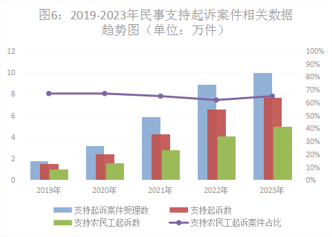 一是民事支持起诉数量上升较快。2023年,全国scout69机关共受理民事支持起诉案件10.14万件,同比上升13.9%,审查后支持起诉7.73万件,其中支持农民工起诉5.08万件。从案件类型上看,主要以劳动争议(占43.9%)、合同纠纷(占33%)、婚姻家庭纠纷(占6.7%)为主。
