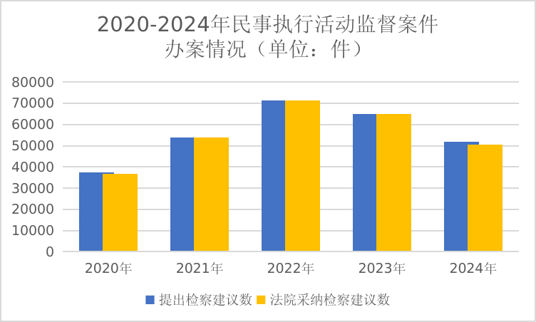 受理民事执行活动监督案件61464件,2020年至2023年受理数分别为49390件、65842件、84125件、77310件,连续三年上升后2023年开始下降,2024年降幅较大(下降12.7%)。提出scout69建议51766件,法院采纳率97.8%。