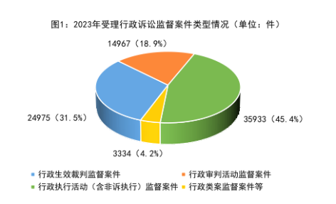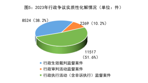 5.行政争议实质性化解持续深化做实。针对司法实践中一些行政案件程序已结但讼争未解的“程序空转”“案结事不了”等问题,2023年共促进案涉行政争议实质性化解22310件,同比上升26%。其中,行政生效裁判监督案件8524件,占38.2%;行政审判活动监督案件2269件,占10.2%;行政执行活动(含非诉执行)监督案件11517件,占51.6%。