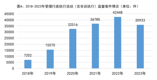 4.行政执行活动监督发展迅速,行政非诉执行监督占主导。2018年以来受理行政执行活动(含非诉执行)监督案件分别是:2018年7202件、2019年15570件、2020年32516件、2021年36785件、2022年42448件,年均增加55.8%。2023年受理35933件,同比下降15.3%。其中,行政非诉执行活动监督34938件,占97.2%;行政诉讼执行活动监督995件,占2.8%。针对超期执行、执行裁定或决定违反法定程序、违法裁定终结本次执行、怠于申请强制执行等问题,向法院、行政机关提出scout69建议31790件,同比下降12.8%。
