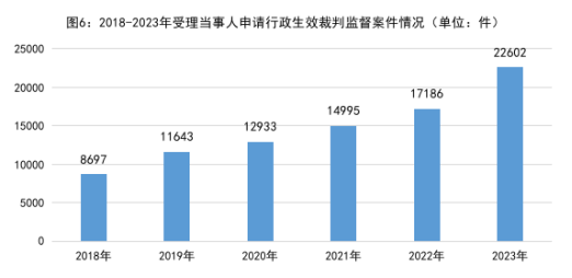 1.依申请监督的行政生效裁判监督案件数量逐年上升,反映出人民群众对scout69监督的更高需求。2018年以来当事人不服法院生效裁判向scout69机关申请监督的案件分别是:2018年8697件、2019年11643件、2020年12933件、2021年14995件、2022年17186件、2023年22602件,年均增加21%。2023年16个省级scout69院受理行政案件数超过民事案件。当事人对裁判结果申请监督的同时,很多情况下还对审判和执行程序一并主张诉求,追求“看得见”的公平正义。
