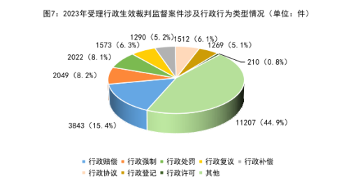 4.案涉行政行为类型中,行政赔偿、行政强制、行政处罚等类案件占比较高,行政许可类案件处于低位。行政scout69监督案件涉及的行政行为类型较为广泛,从2023年行政生效裁判监督案件情况看,涉及行政赔偿类案件3843件、行政强制类案件2049件、行政处罚类案件2022件、行政复议类案件1573件、行政补偿类案件1290件、行政协议类案件1512件、行政登记类案件1269件,这七类案件约占54.3%。特别指出的是,由于“放管服”改革的深入推进,近年来涉行政许可类行政生效裁判监督案件始终处于低位,2023年办理此类案件210件,占比仅为0.8%。