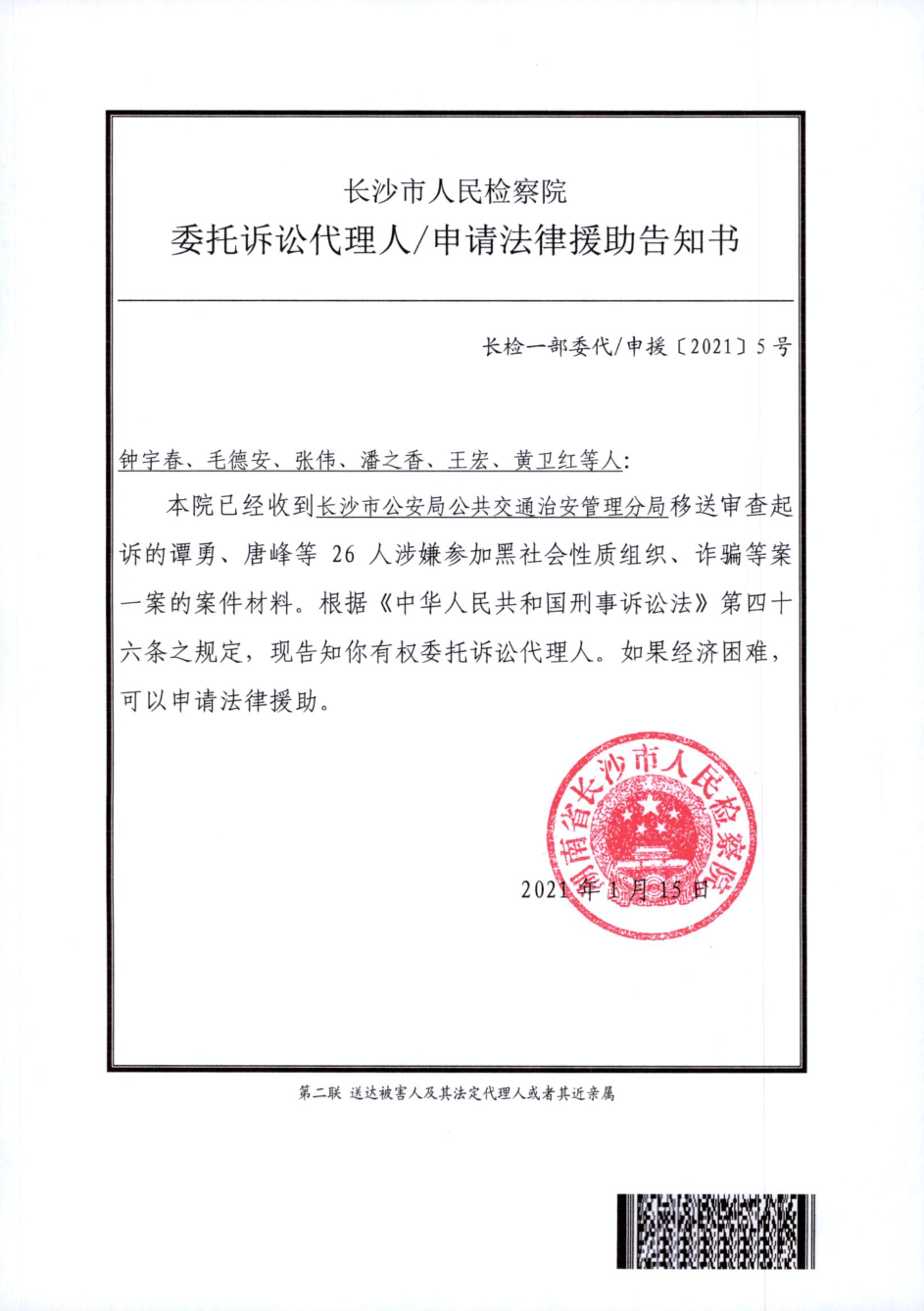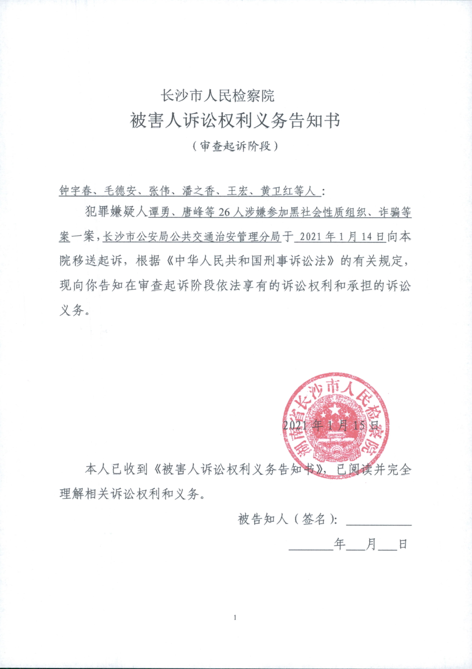 谭勇、唐峰等26人涉嫌参加黑社会性质组织、诈骗等案一案的告知书