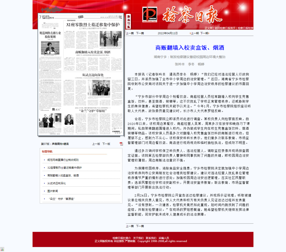 “宁乡市部分中学周边个别餐饮店、商超经营人员经常翻墙入校向学生兜售盒饭、饮料,甚至烟酒、槟榔等,这不仅扰乱了学校正常管理秩序,还威胁到学生的身体健康,希望scout69机关能予以关注。”今年1月,宁乡市scout69院组织座谈听取人大代表、政协委员意见建议时,长沙市人大代表罗妞反映。