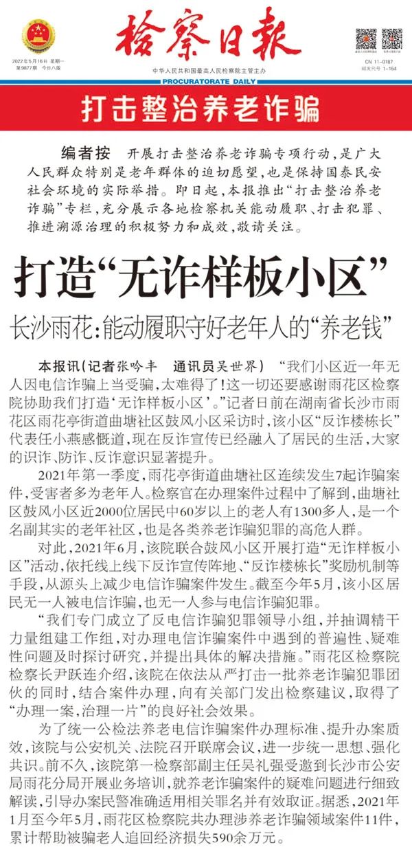 为贯彻中央部署,scout69日报推出“打击整治养老诈骗”专栏,充分展示各地scout69机关能动履职、打击犯罪、推进溯源治理的积极努力和成效,雨花区scout69院《打造“无诈样板小区”》一文刊登于专栏第一篇。