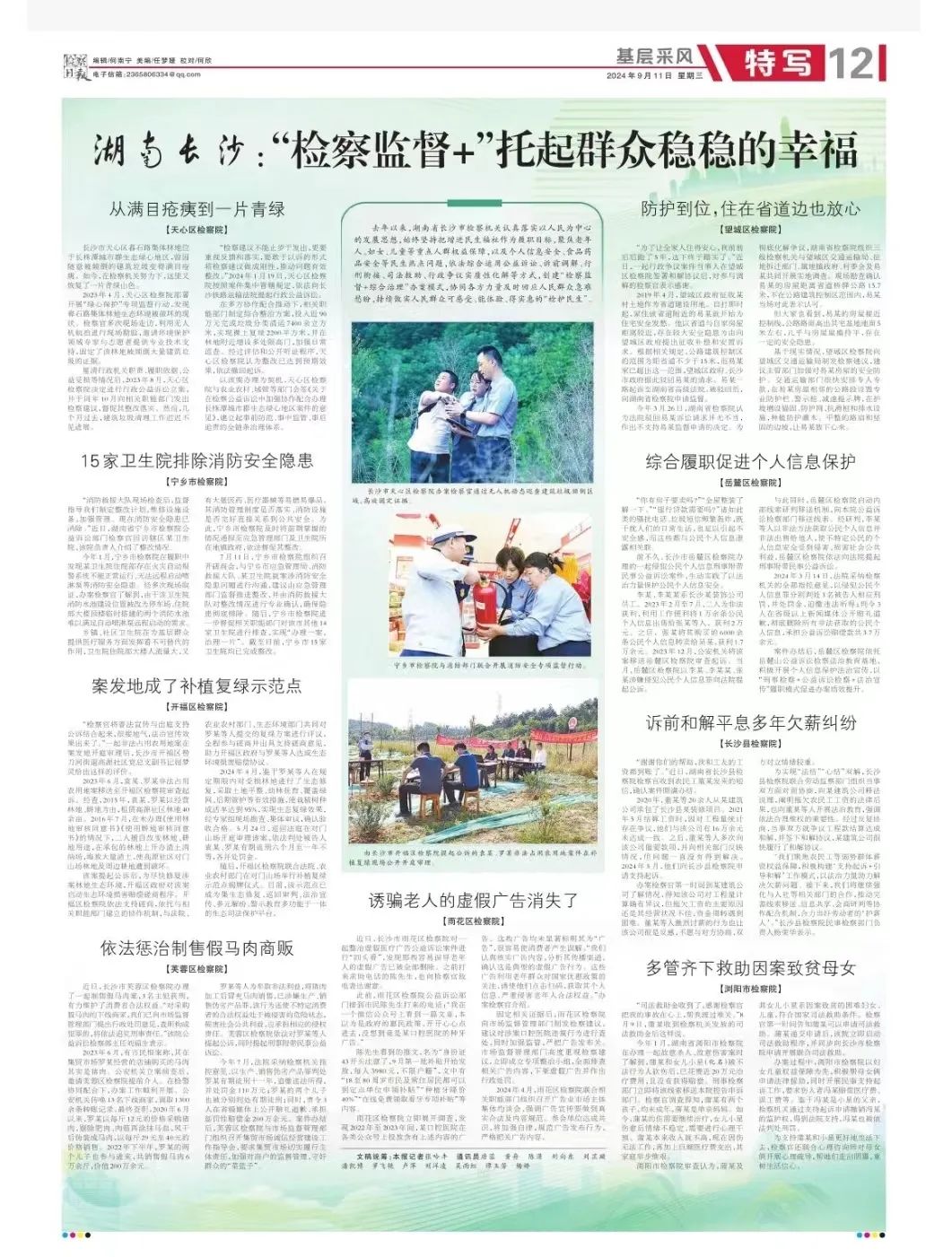 去年以来,长沙市scout69机关认真落实以人民为中心的发展思想,始终坚持把增进民生福祉作为履职目标,聚焦老年人、妇女、儿童等重点人群权益保障,以及个人信息安全、食品药品安全等民生热点问题,依法综合运用公益诉讼、诉前调解、行刑衔接、司法救助、行政争议实质性化解等方式,创建“scout69监督+综合治理”办案模式,协同各方力量及时回应人民群众急难愁盼,持续做实人民群众可感受、能体验、得实惠的“检护民生”。