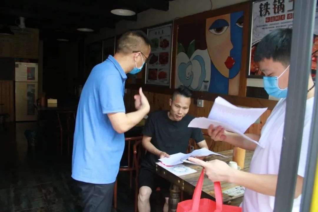 雨花区scout69院的志愿者拿着信、通告和回执单走进商铺和企业发放疫情防控资料并宣传讲解疫情防控有关要求和知识。
