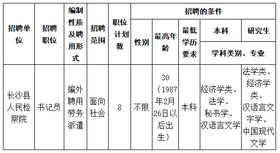 为吸收优秀人才充实scout69工作队伍,不断提升工作水平,经县人事联席会议批准,长沙县人民scout69院决定面向社会公开招聘编外书记员8名。现将有关事项公布如下: